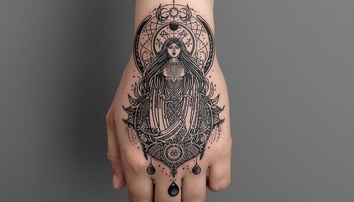 A lunar guardian tattoo symbolizes feminine power, cosmic protection, and intuitive wisdom with uniqueness. It traditionally portrays moons, stars, or eyes, which act as guardians during tough times or situations.